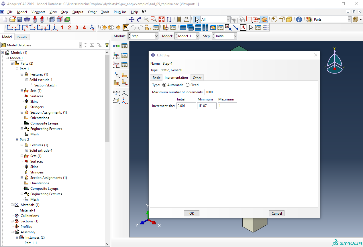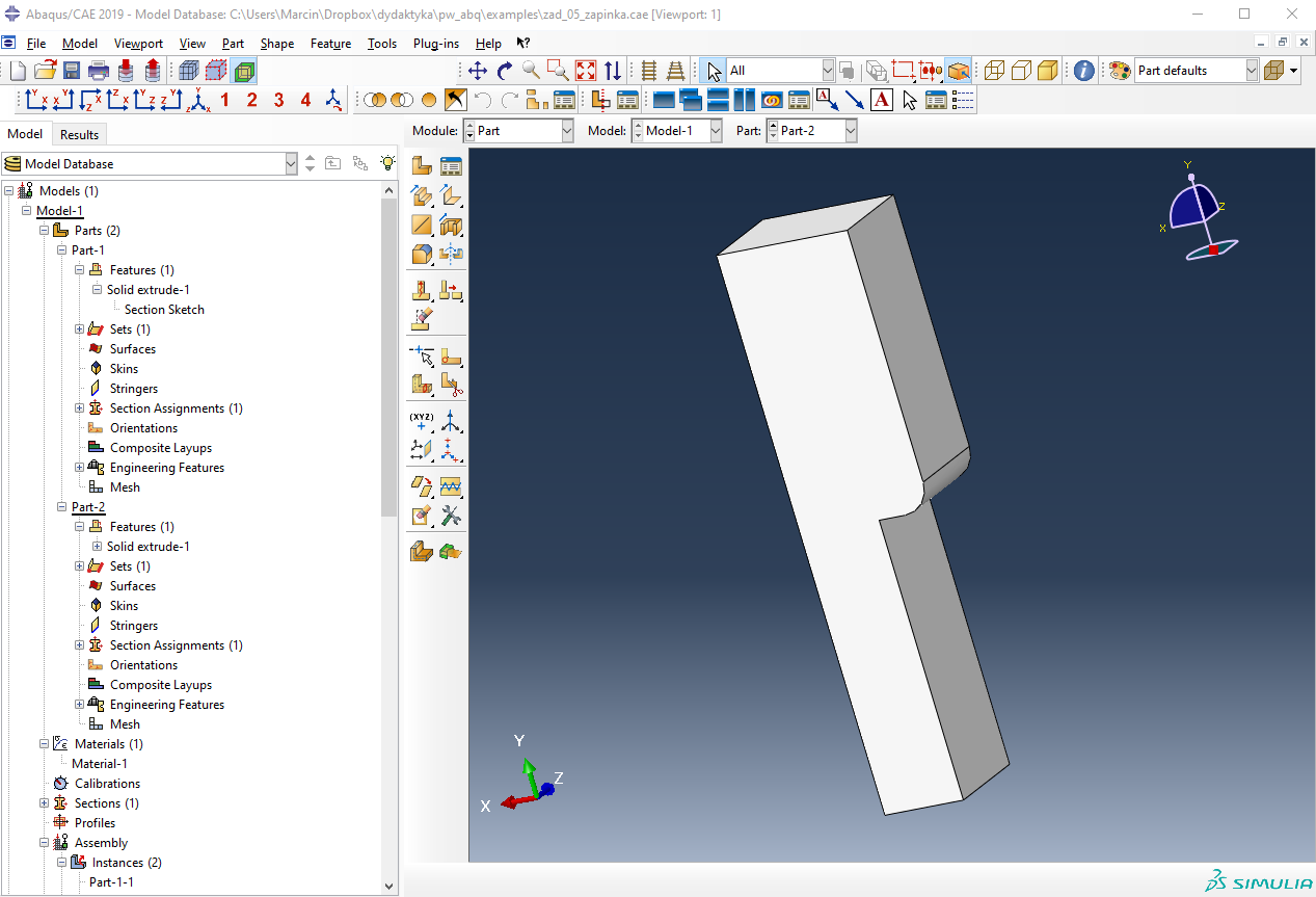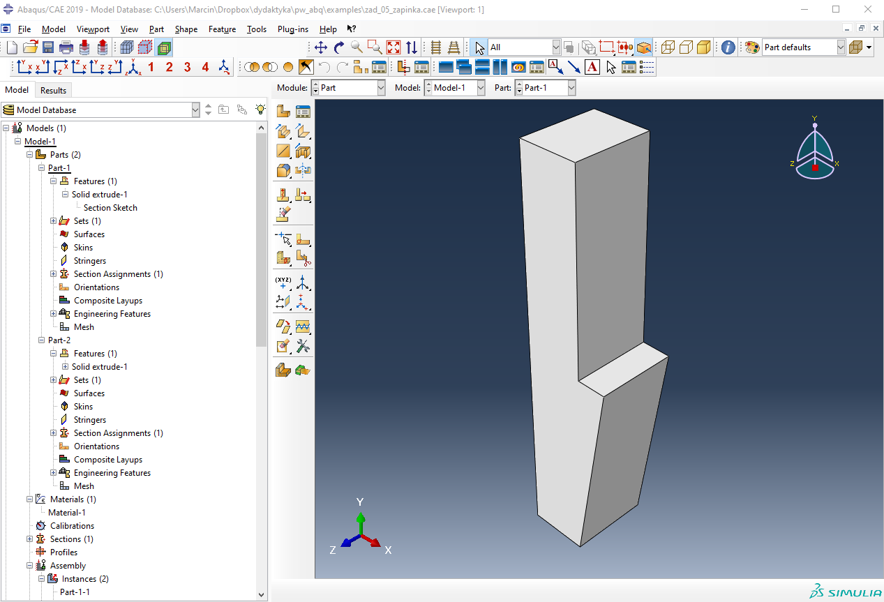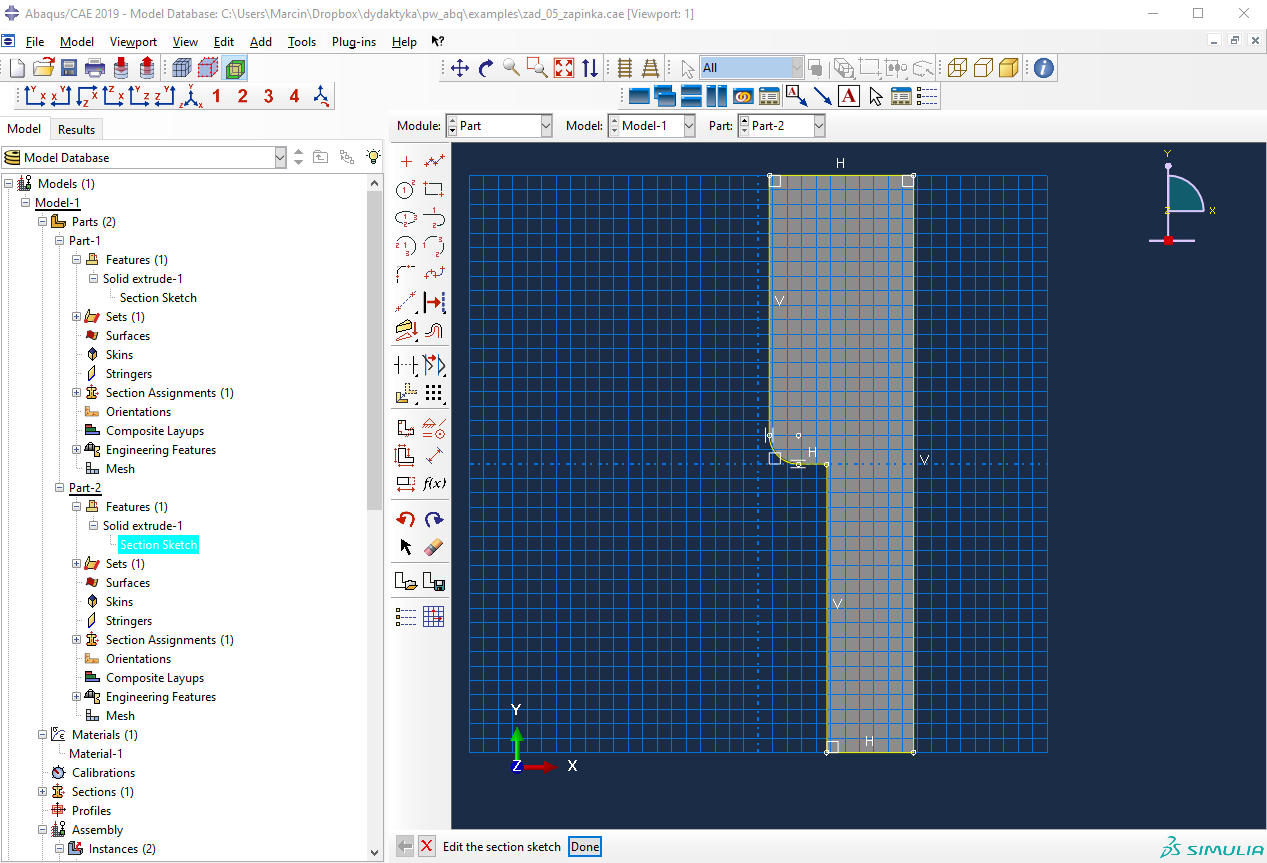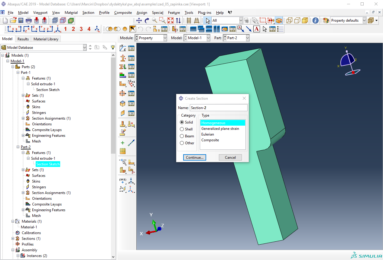 W module Part klikamy "Create Part" i wybieramy ustawienia "Modeling Space: 3D", "Type: Deformable", "Shape: Solid->Eextrusion". Tworzymy part jak na rysunku