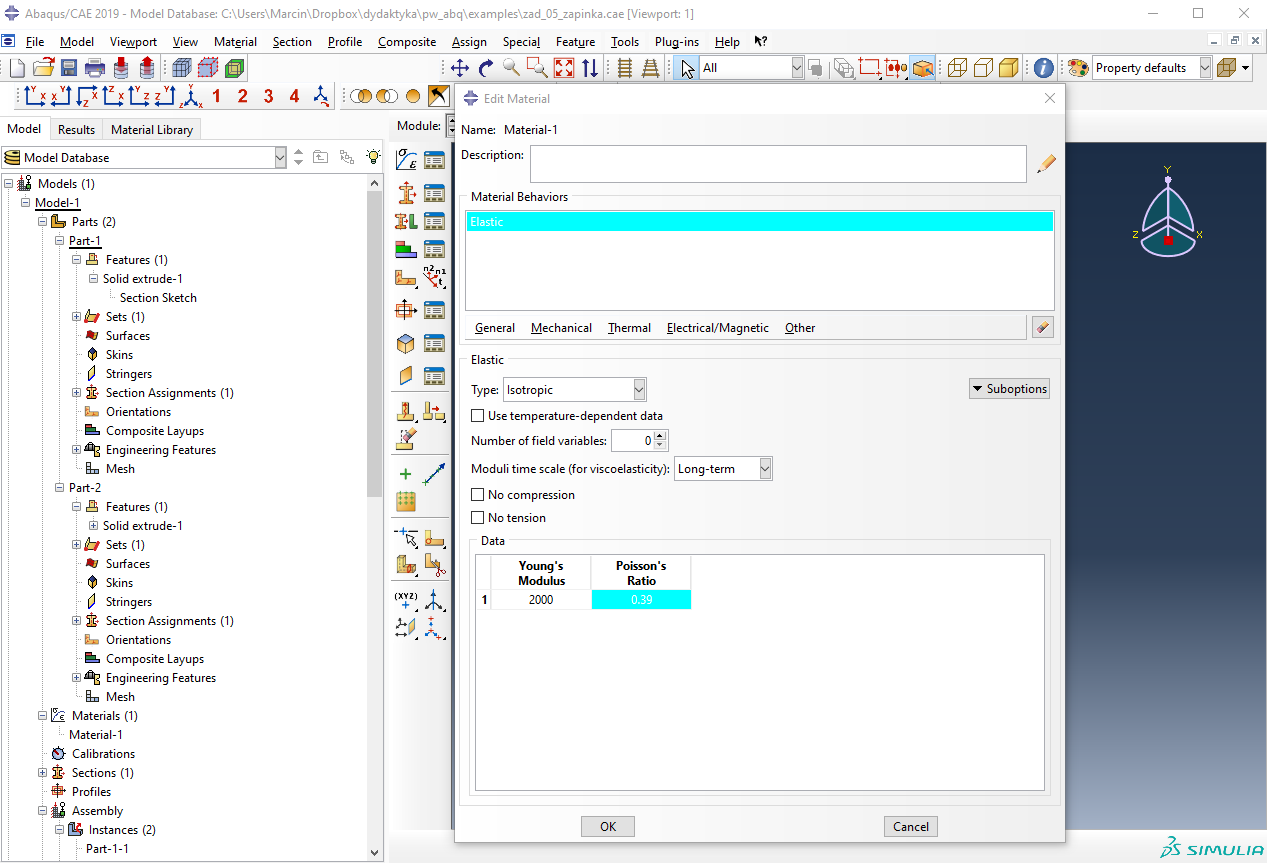W module "Property" tworzymy sprężysty materiał o następujących parametrach zgodnie z rysunkiem.