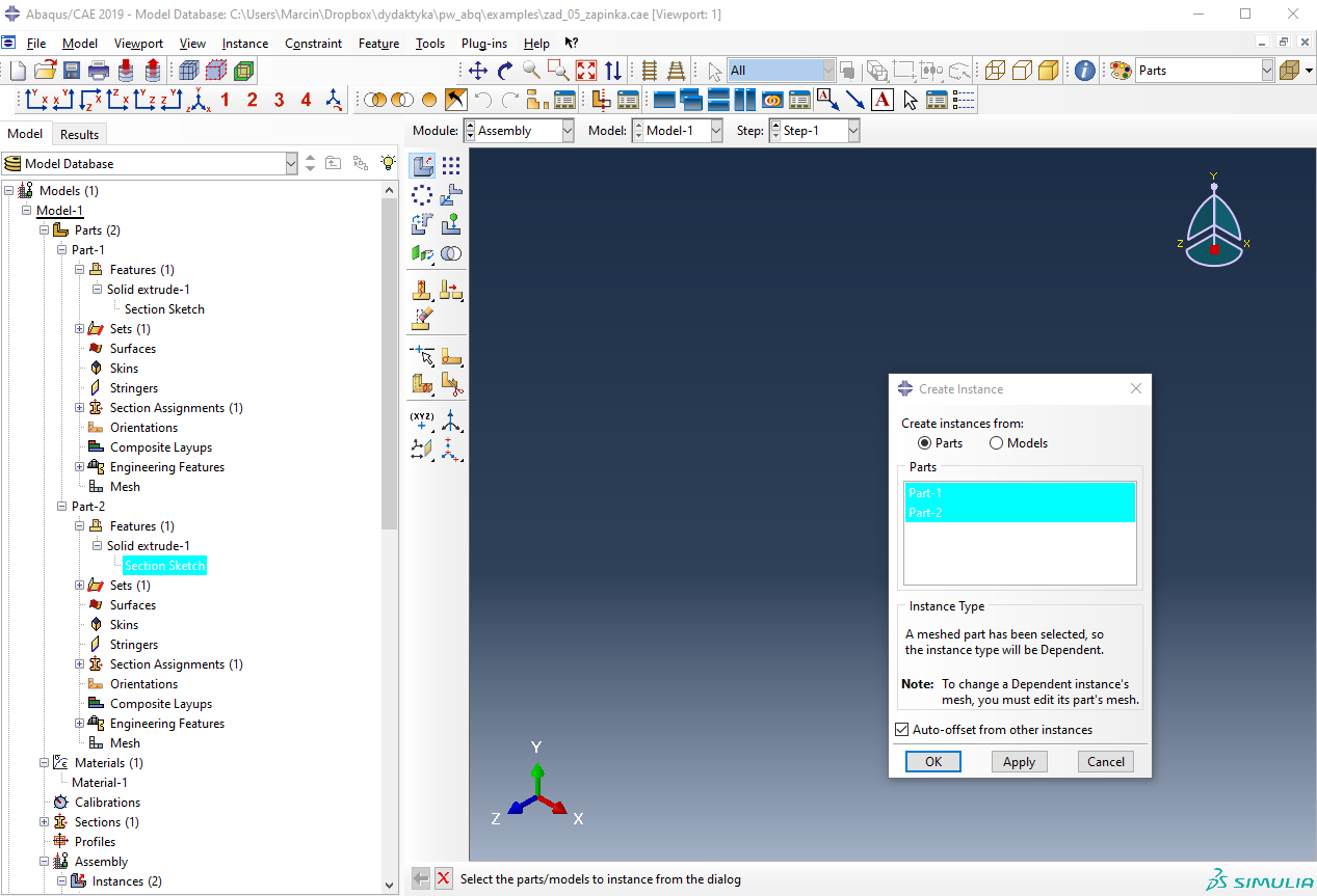 Przechodzimy do moduły "Assembly" i klikamy "Create Instanace". zaznaczamy dwa party i klikamy "Ok"