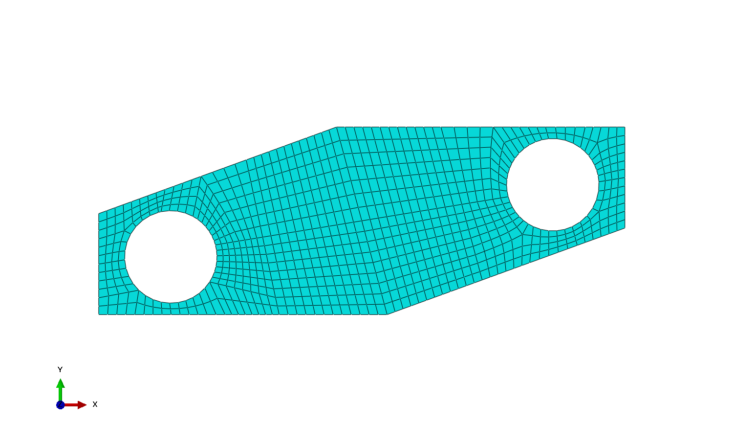 Analizowana część pełni rolę łącznika. Na brzegu lewego otworu należy zablokować możliwość przemieszczania się. Do brzegu prawego otworu należy zadać przemieszenie powodujące przesuw w prawą stronę o wartość równą średnicy otworu.