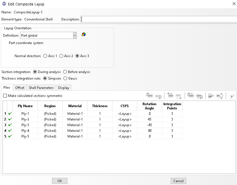 Każda warstwa ma grubość 1mm i jest obrócona względem osi $z$ o zadany kąt. UWAGA - jeżeli analizujemy układ warstwowy to nie musimy dodatkowo tworzyć sekcji i przypisywać ją do geometrii.