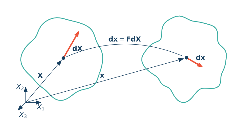 Gradient deformacji transformuje wektor $d\X$ na wektor $d\x = \F d\X$ - czyli opisuje deformację włókna materialnego $d\X$ (infinitezymalny element liniowy).