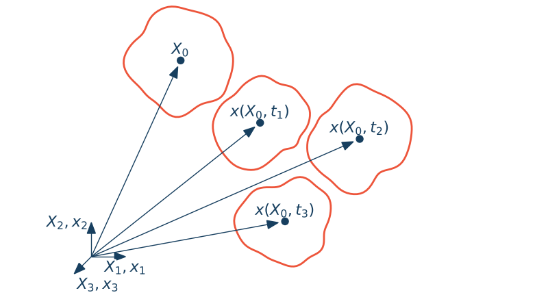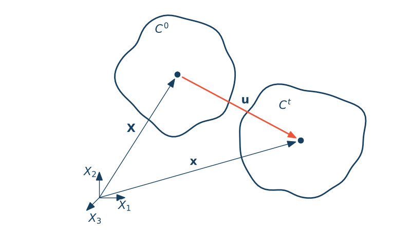 Opis materialny nazywany jest również opisem Lagrange'a. Ruch ciała interpretujemy jako transformację współrzędnych punktów materialnych $\X$ z uwzględnieniem czasu do ich aktualnego położenia $\x$ .
