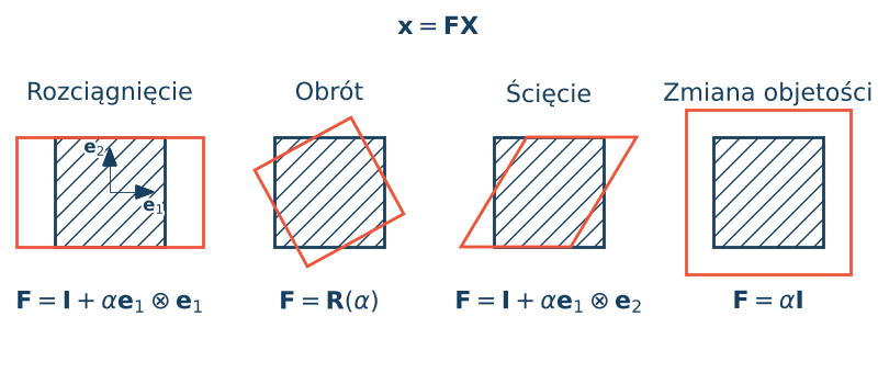 Jeżeli równanie ruchu w opisie Lagrange'a zapiszemy jako $\x=\F\X$ gdzie $\F$ jest stałym tensorem to otrzymujemy równanie opisujące jednorodną deformację. Różniczkując równanie ruchu otrzymujemy, że tensor $\F$ jest gradientem deformacji. Na poniższym rysunku przedstawiono geometryczne interpretacje deformacji jednostkowego kwadratu w zależności od postaci tensora $\F$.
